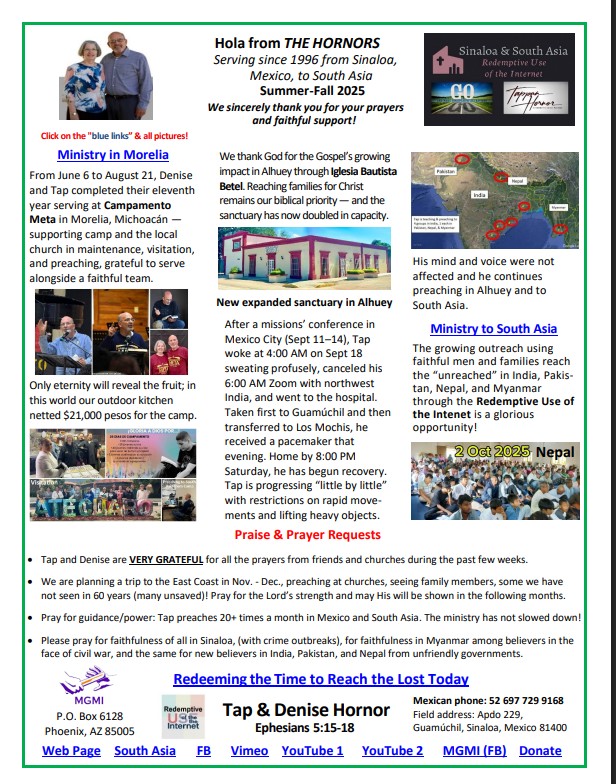 Tap and Denise Hornor got married in 1978 and have three sons and eleven grandchildren. They have been actively involved in ministry since 1996 under MGM International, dedicating their lives to planting churches and spreading the Gospel in Sinaloa, Mexico.